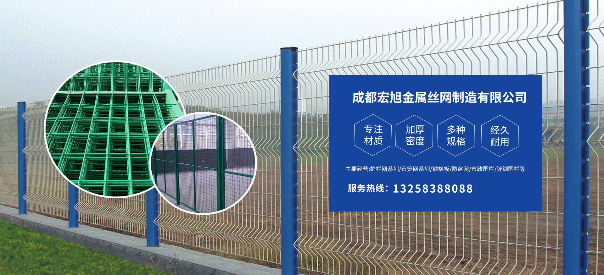 成都宏旭金屬絲網(wǎng)制造有限公司主營護(hù)欄網(wǎng)系列、石籠網(wǎng)系列、鋼格板、防盜網(wǎng)、市政圍欄、鋅鋼圍欄、鋼筋網(wǎng)片、聲屏障系列、波形護(hù)欄板、柔性纜索護(hù)欄、SNS邊坡防護(hù)網(wǎng)等其他絲網(wǎng)類產(chǎn)品。特殊規(guī)格可加工定做,也可根據(jù)客戶來圖來樣定做。自創(chuàng)業(yè)以來,公司一直堅(jiān)持市場為導(dǎo)向,以客戶為根本,以實(shí)業(yè)為基礎(chǔ),以技術(shù)為支持,以科研為后盾,集科研、生產(chǎn)、經(jīng)營為一體,不斷研制開發(fā)新產(chǎn)品,開拓市場,走綜合發(fā)展之路。多年來,公司憑借過硬的質(zhì)量,良好的信譽(yù)、優(yōu)質(zhì)的服務(wù)、合理的價(jià)格,贏得了市場和商家的一致好評(píng)。